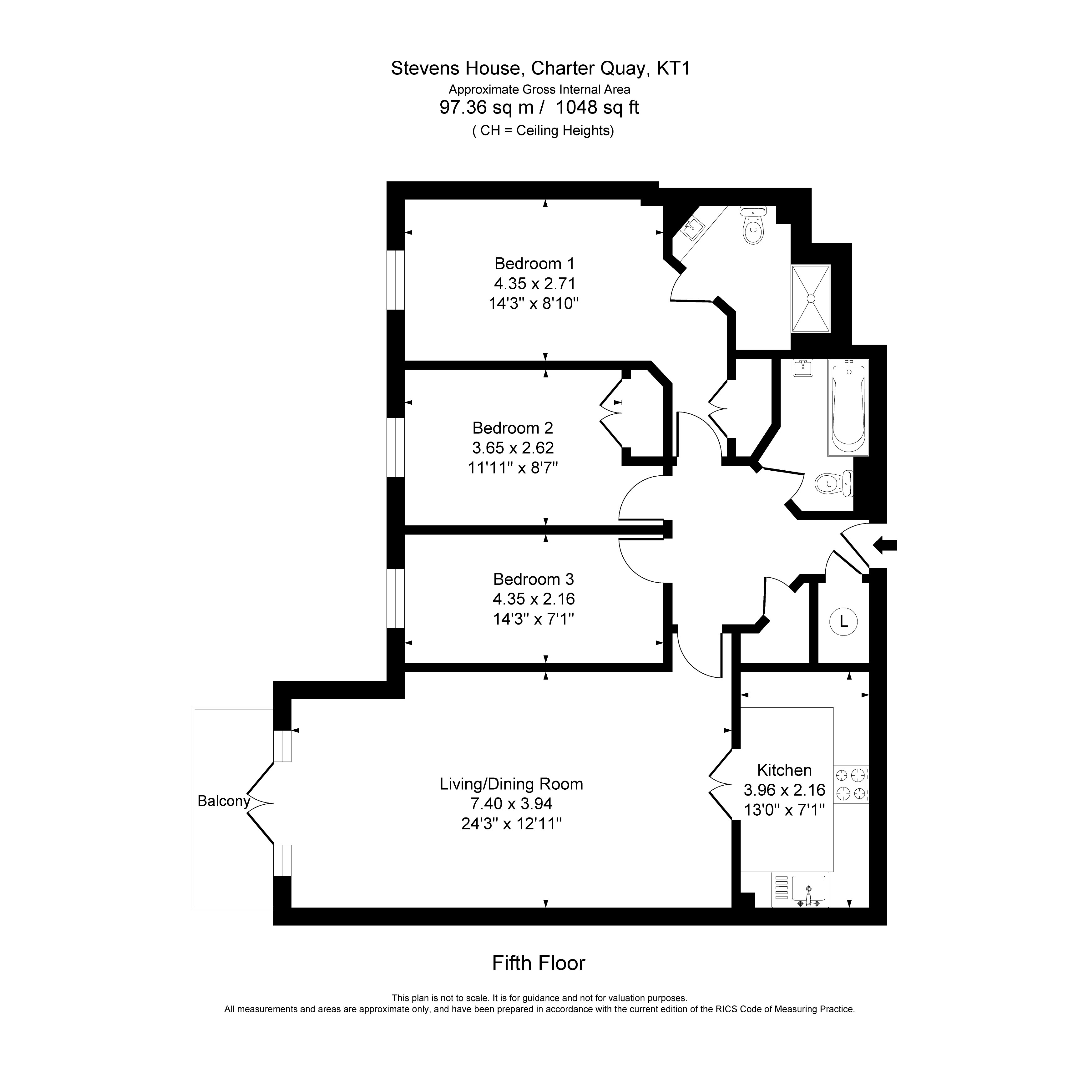 Spacious 3 Bedroom Apartment for sale within the popular Charter Quay Riverside Development This rarely available three bedroom apartment is located on the 5th floor and offers far reaching views. The property offers 1,048 sq ft of internal living space, a bright and spacious reception room with doors opening out to a private balcony Principal bedroom with fitted wardrobes, an en-suite shower room. Two further double bedrooms, and further bathroom off the hallway. The property also benefits from 24 hour concierge, residents health suite, lift service and secure allocated underground parking for one car, 24hr concierge service, residents health suite and share of freehold.