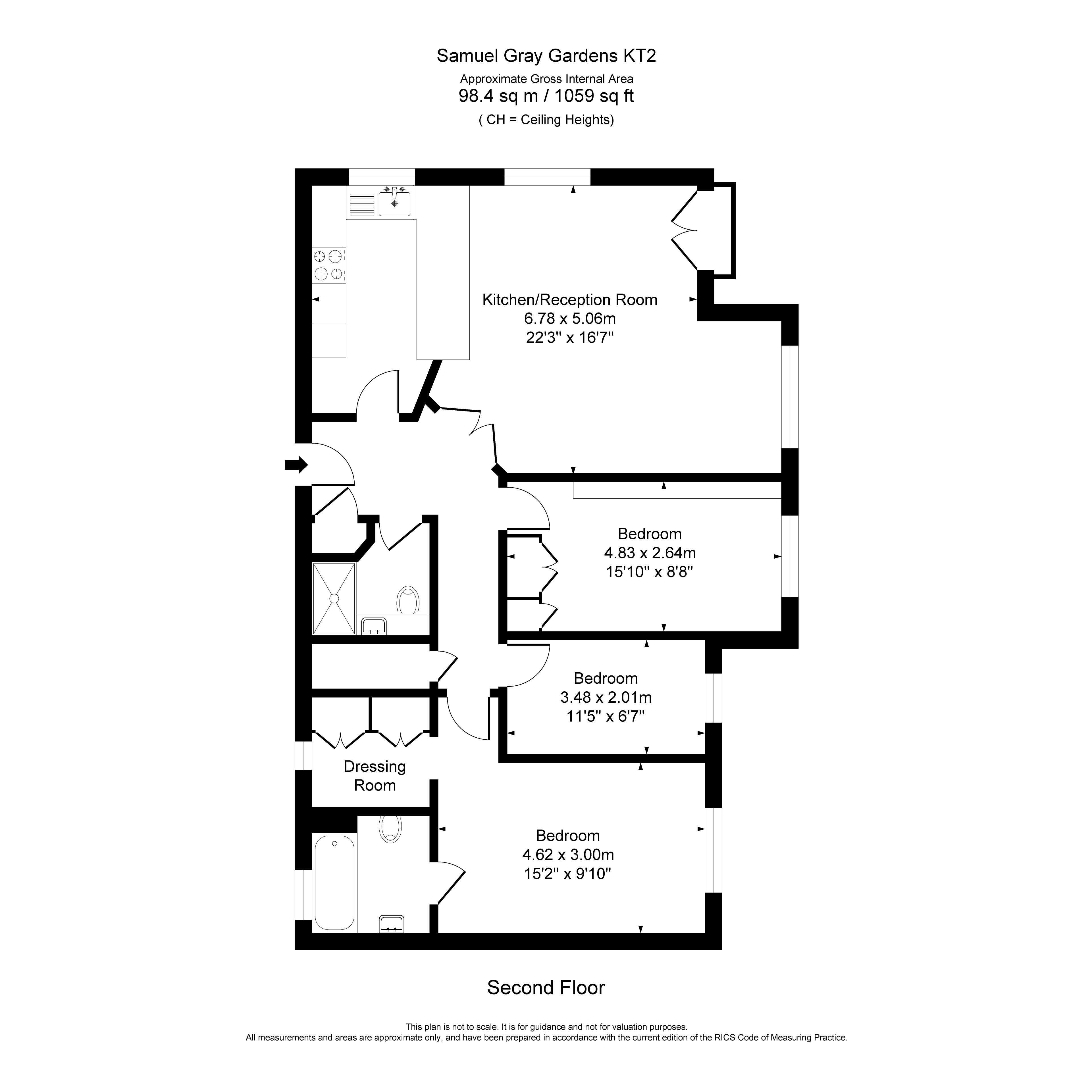 Top floor 3 bedroom apartment set in a private gated development in Kingston upon Thames, with 2 allocated parking spaces. Located on the 2nd/Top Floor with a spacious living/dining room, offering 1,059 sq ft of internal living space. Open plan living with a stylish refitted kitchen, breakfast bar and wood flooring. Principal Bedroom with a luxury ensuite shower room and walk in dressing area, 2 further Bedrooms and a family bathroom. The property is Ideally situated in the popular Samuel Gray Gardens development, a stone’s throw of Canbury Gardens and the River Thames. Within walking distance of Kingston town centre and mainline train station with frequent trains to London Waterloo. This wonderful property is offered to the market chain free and must be seen.